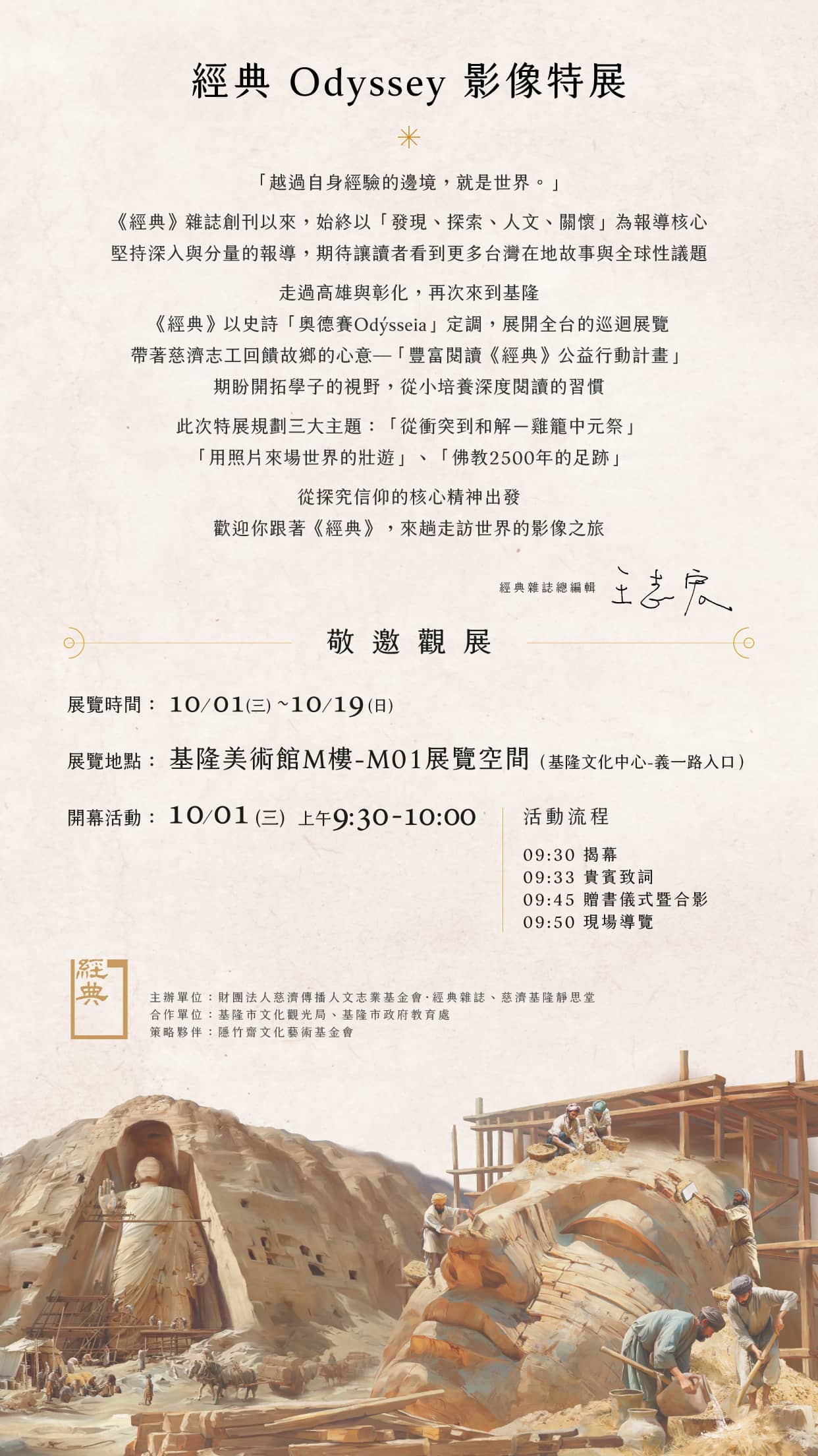 - 《經典》雜誌主辦「經典 Odyssey in 基隆」影像特展,訂於114年10月1日至10月19日假基隆美術館M樓-M01展覽空間舉辦。並結合「豐富閱讀《經典》公益行動計畫」,於114學年10月正式寄送《經典》雜誌至全市國、高中有意願參與計畫的學校及班級。